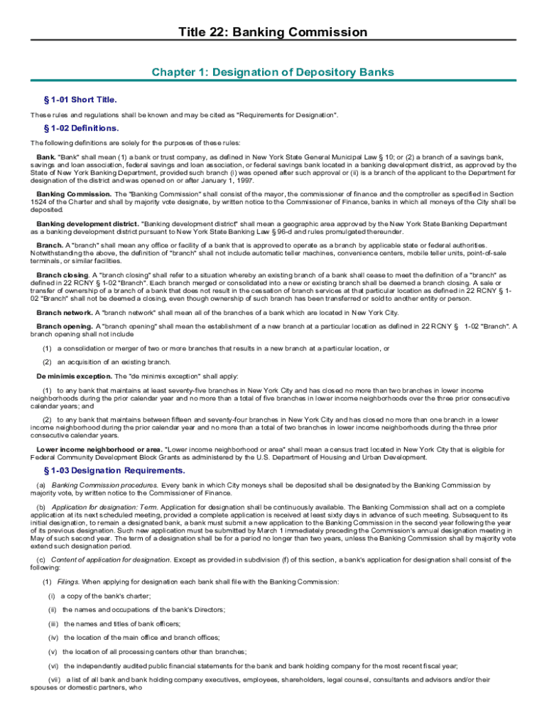 Title 22: Banking Commission Chapter 1: Designation of Depository Banks 101 Short Title. These rules and regulations shall be known and may be cited as \” Requirements for Designation\”. 102 Definitions.