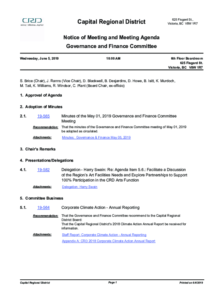 Capital Regional District625 Discard St., Victoria, BC V8W 1R7Notice of Meeting and Meeting Agenda Governance and Finance Committee Wednesday, June 5, 201910:00 AM6th Floor Boardroom 625 Discard St.