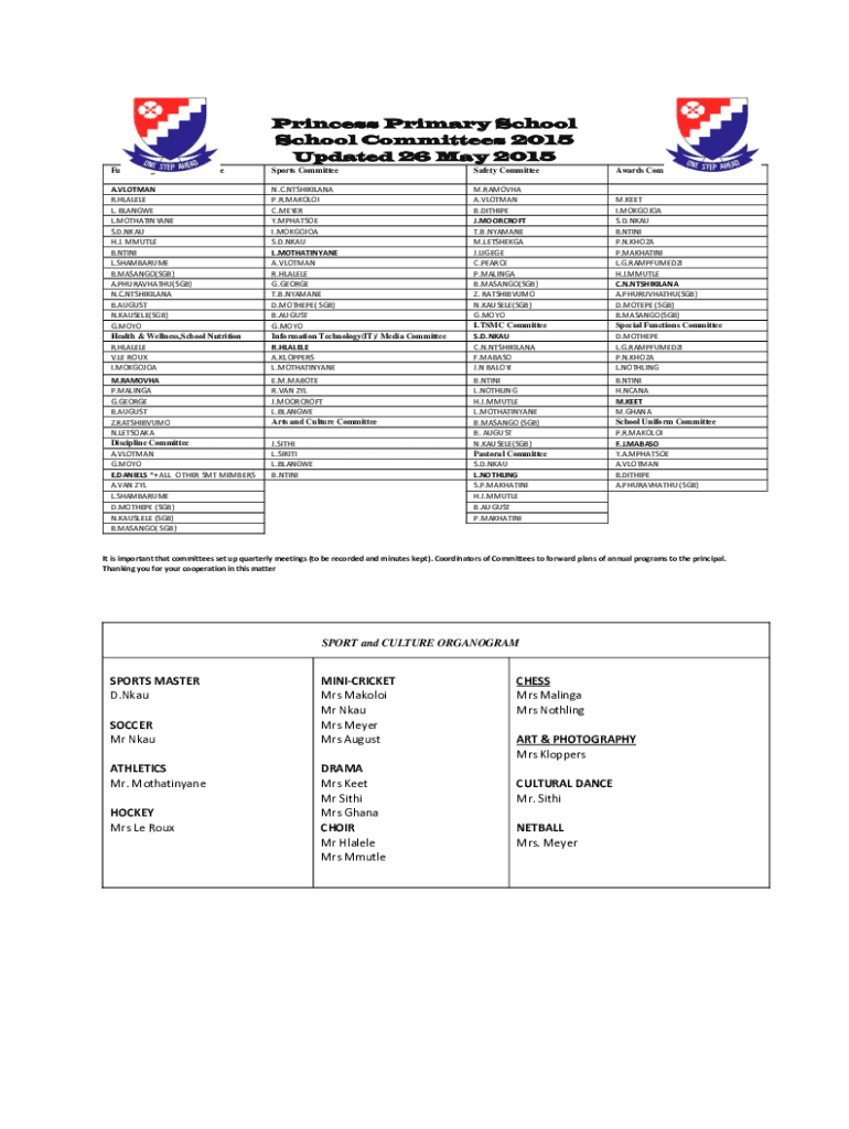 Princess Primary School Committees 2015 Updated 26 May 2015 Fundraising Events Committee Sports CommitteeSafety CommitteeAwards Committee. FOOTMAN R.ALLELE L. BLANCHE L.MOTHATINYANE S.D.NAU H.J. MMU