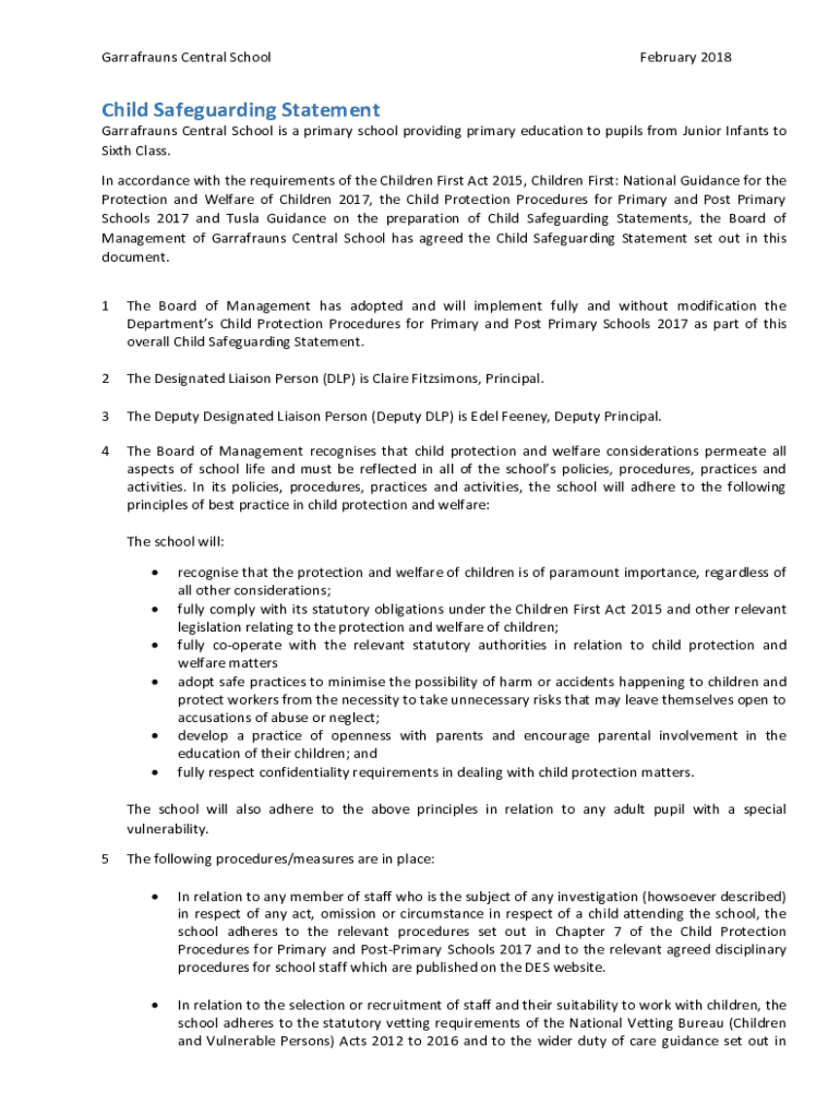 Garrafrauns Central School February 2018Child Safeguarding Statement Garrafrauns Central School is a primary school providing primary education to pupils from Junior Infants to Sixth Class. In accordance