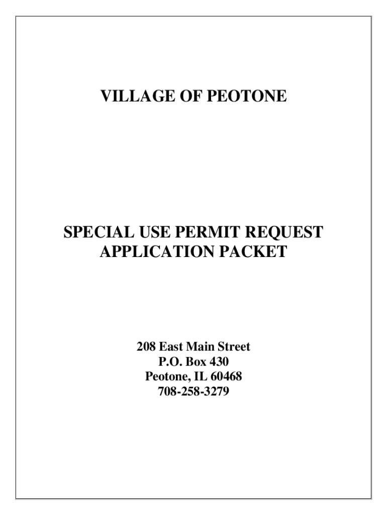 VILLAGE OF PEOTONESPECIAL USE PERMIT REQUEST APPLICATION PACKET208 East Main Street P.O. Box 430 Photon, IL 60468 7082583279INSTRUCTIONS FOR SPECIAL USE PERMIT Process petitioner must submit two (2)