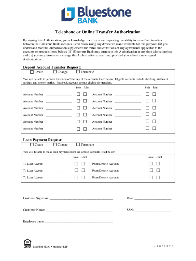 Telephone or Online Transfer Authorization By signing this Authorization, you acknowledge that (i) you are requesting the ability to make fund transfers between the Blue stone Bank accounts listed