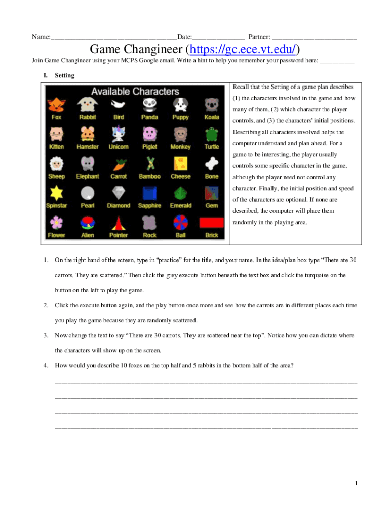 Name:___Date:___ Partner: ___Game Changing (https://gc.ece.vt.edu/) Join Game Changing using your MCPS Google email. Write a hint to help you remember your password here: ___ I. Setting Recall that