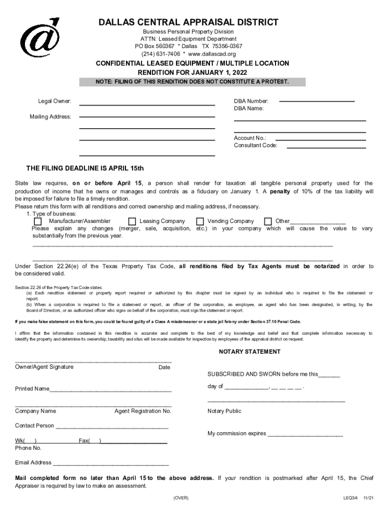 DALLAS CENTRAL APPRAISAL DISTRICT Business Personal Property Division ATTN: Leased Equipment Department PO Box 560367 * Dallas TX 753560367 (214) 6317406 * www.dallascad.orgCONFIDENTIAL LEASED EQUIPMENT