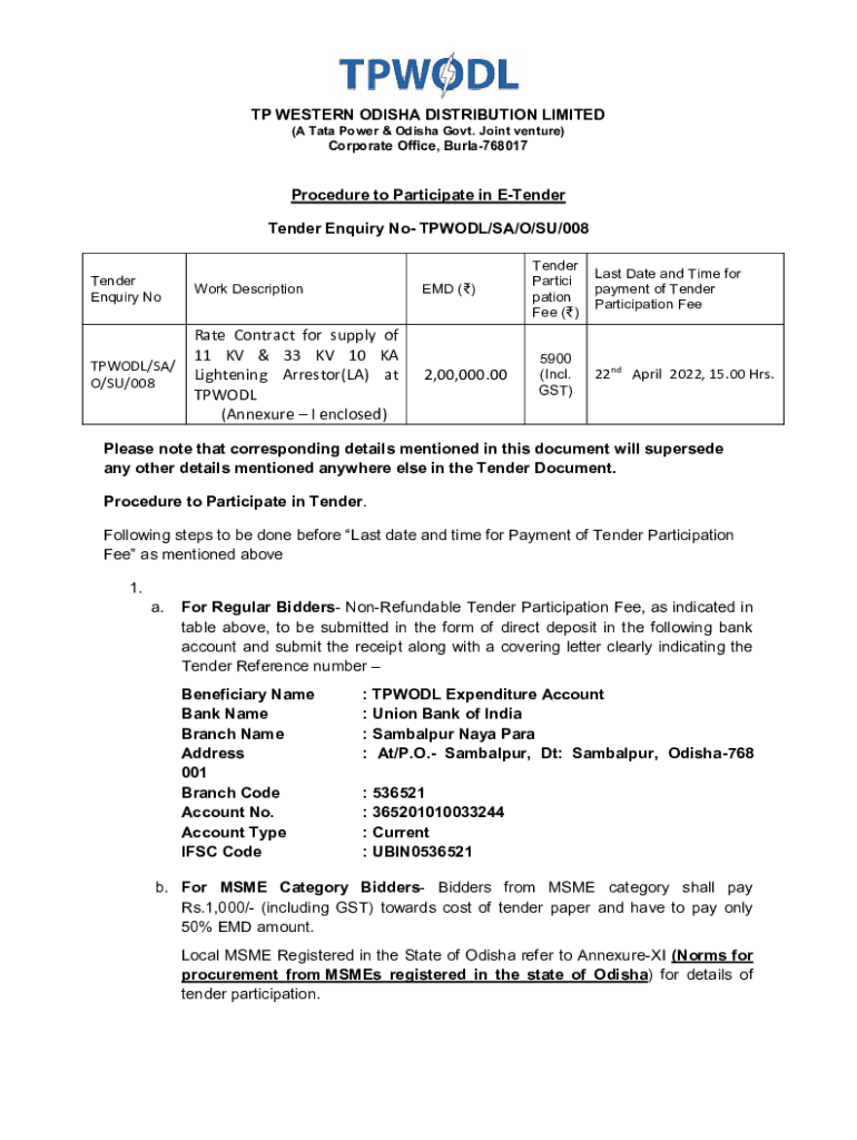 TP WESTERN ODISHA DISTRIBUTION LIMITED (A Tata Power & Odisha Govt. Joint venture)Corporate Office, Burla768017Procedure to Participate in Tender Inquiry No TWO/SA/O/SU/008Tender Inquiry Notwork Description