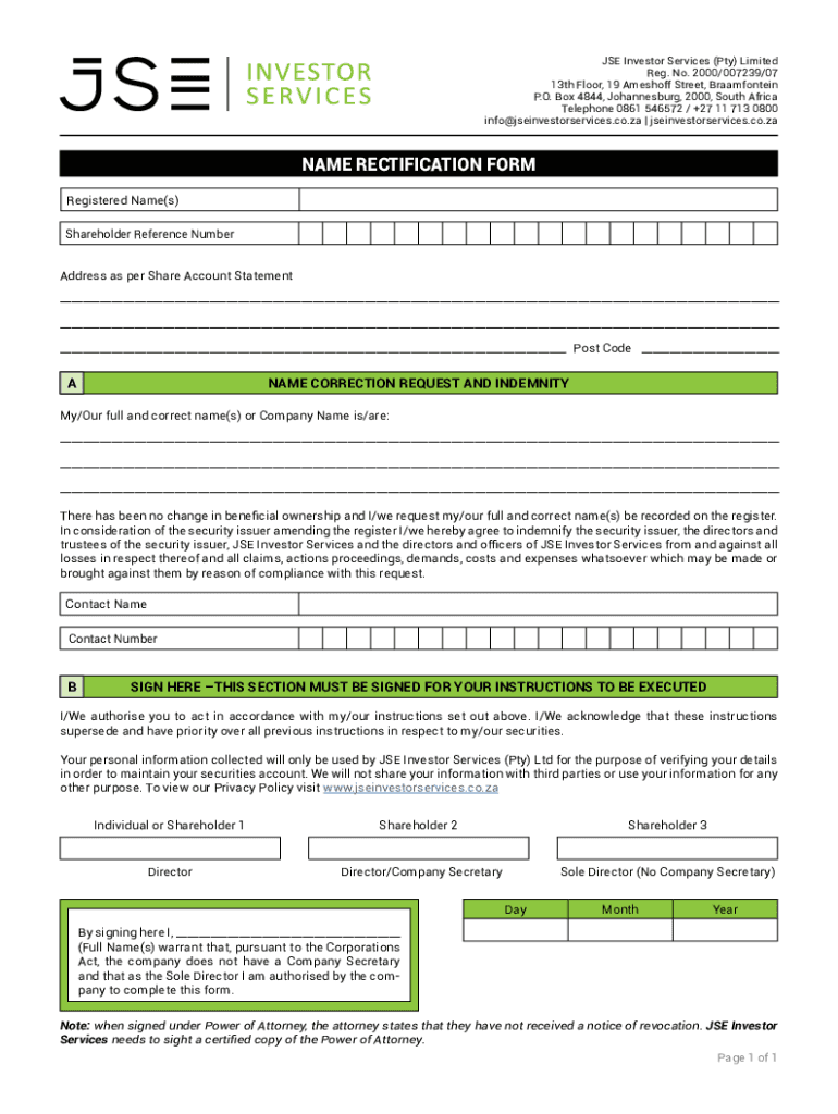 Get the free NAME RECTIFICATION FORM - JSE INVESTOR SERVICES
