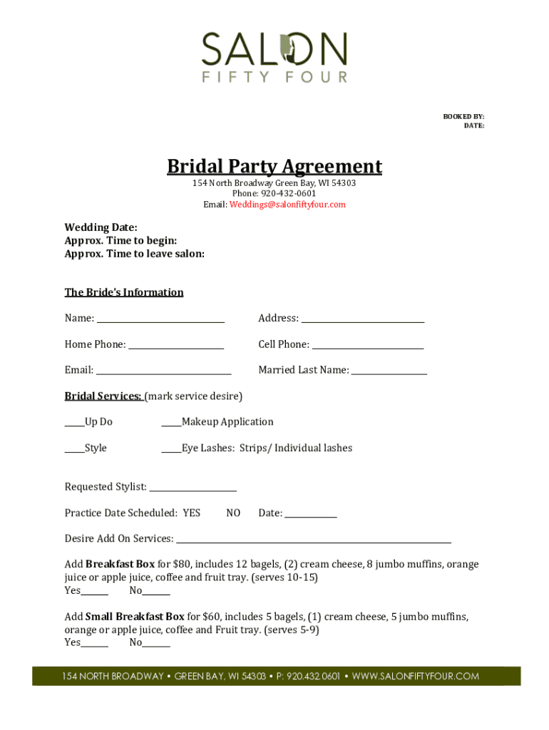 BOOKED BY:DATE:Bridal Party Agreement154 North Broadway Green Bay, WI 54303Phone: 9204320601Email: Weddings@salonfiftyfour.comWedding Date:Approx. Time to begin:Approx. Time to leave salon:The Brides