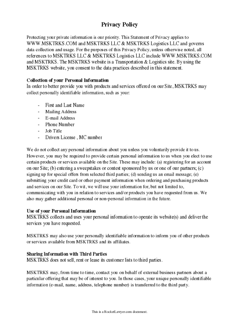 WWW.MSKTRKS.COM and MARKS LLC & MARKS Logistics LLC and governs