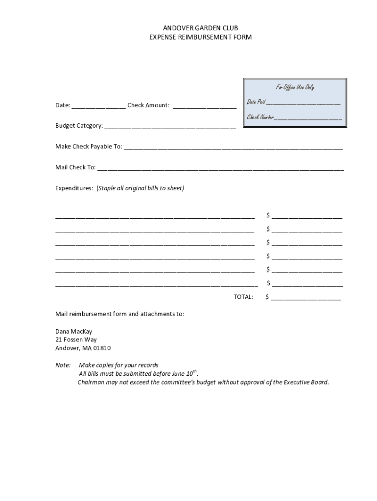 ANDOVER(GARDEN(CLUB(EXPENSE(REIMBURSEMENT(FORM((((((For Office Use Validate:(___(Check(Amount:((___(Date Paid ___ Check Number___Budget(Category:(___(Make(Check(Payable(To:(___(((((((((Mail(Check(To:(___(Expenditures:(((Staple\'all\'original\'bills\'to\'sheet)(((___(((((((($(___((((((((___(((((((($(___(___(((((((($(___(___(((((((($(___(___(((((((($(___(___(((((($(___(((((((((((((((((((((((TOTAL:(((((((($(___(Mail(reimbursement(form(and(attachments(to:(Dana