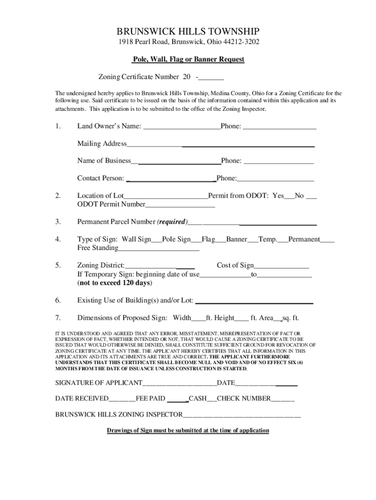 BRUNSWICK HILLS TOWNSHIP 1918 Pearl Road, Brunswick, Ohio 442123202 Pole, Wall, Flag or Banner Request Zoning Certificate Number 20 ___ The undersigned hereby applies to Brunswick Hills Township,