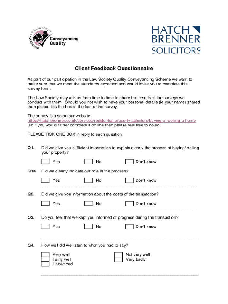 Client Feedback Questionnaire As part of our participation in the Law Society Quality Conveyancing Scheme we want to make sure that we meet the standards expected and would invite you to complete