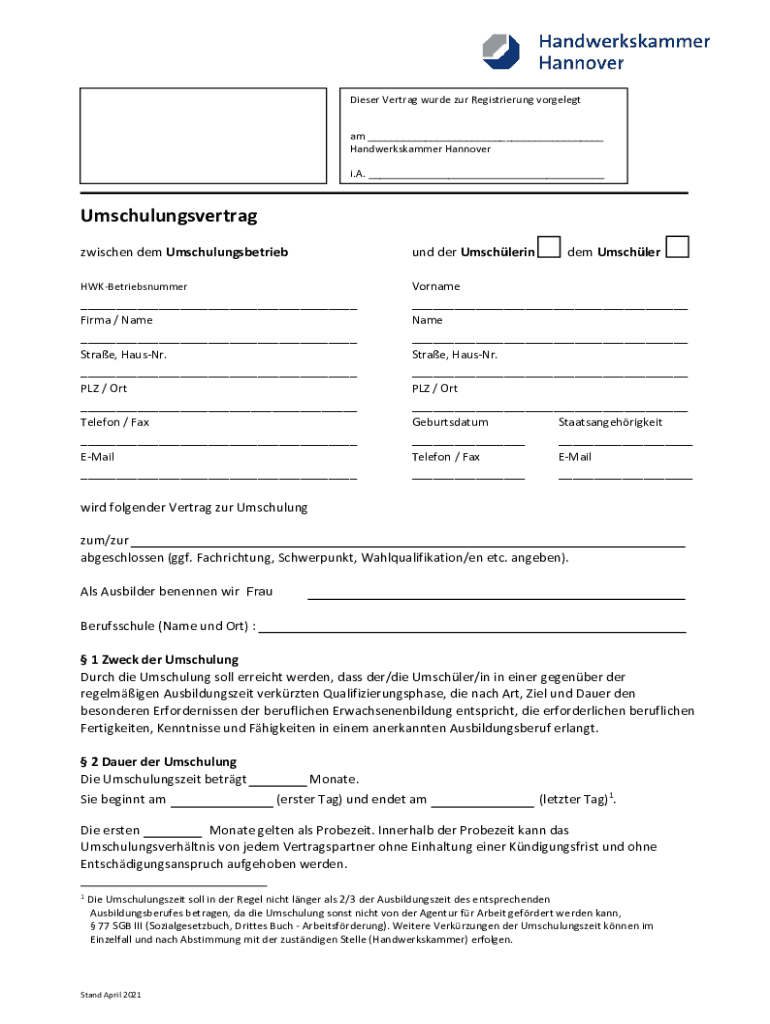 Eingangsstempel her HandwerkskammerUmschulungsvertrag((SSizwischen them Umschulungsbetriebeund her Umschleringidem