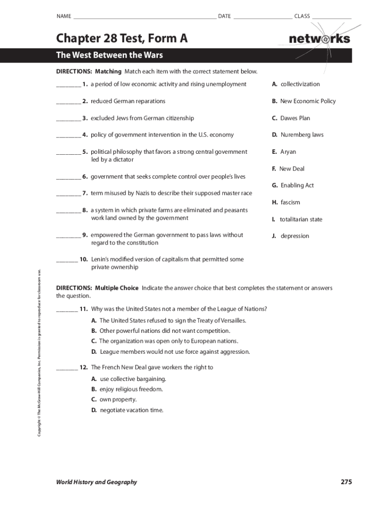 NAME ___ DATE ___ CLASS ___Chapter 28 Test, Form Anew rustle West Between the Wars DIRECTIONS: Matching Match each item with the correct statement below. ___ 1. A period of low economic activity and