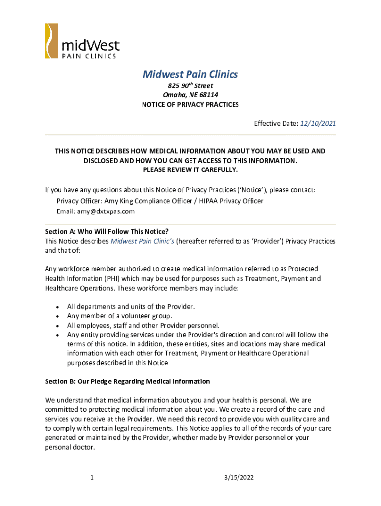 Midwest Pain Clinics 825 90th Street Omaha, NE 68114 NOTICE OF PRIVACY PRACTICES Effective Date: 12/10/2021THIS NOTICE DESCRIBES HOW MEDICAL INFORMATION ABOUT YOU MAY BE USED AND DISCLOSED AND HOW