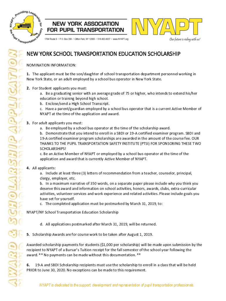NEW YORK SCHOOL TRANSPORTATION EDUCATION SCHOLARSHIP NOMINATION INFORMATION: 1. The applicant must be the son/daughter of school transportation department personnel working in New York State, or an