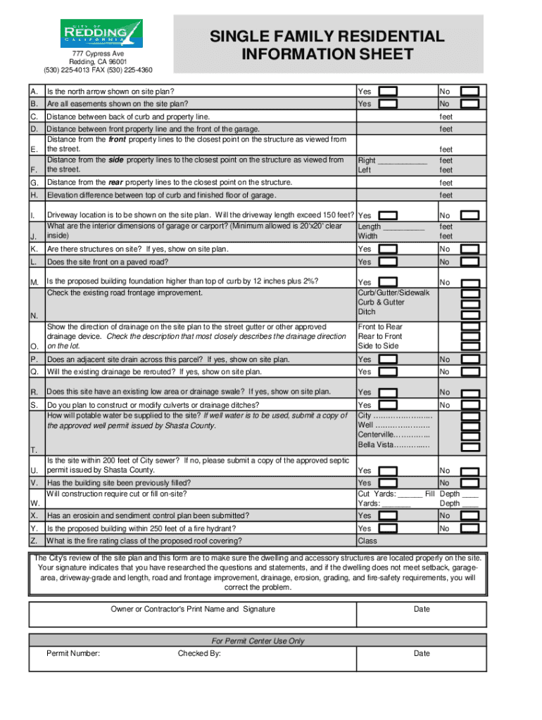 SINGLE FAMILY RESIDENTIAL INFORMATION SHEET777 Cypress Ave Redding, CA 96001 (530) 2254013 FAX (530) 2254360A. Is the north arrow shown on site plan? YesNoYesNoB. Are all easements shown on the site