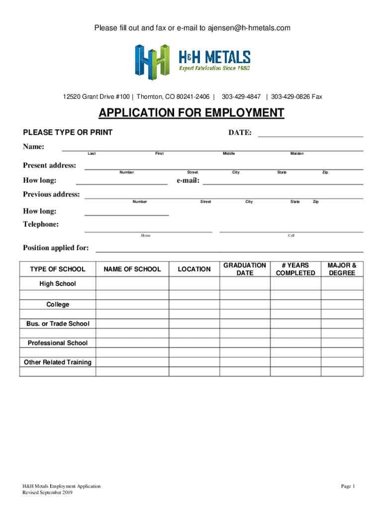 Please fill out and fax or email to ajensen@hhmetals.com12520 Grant Drive #100 | Thornton, CO 802412406 |3034294847 | 3034290826 Application FOR EMPLOYMENT