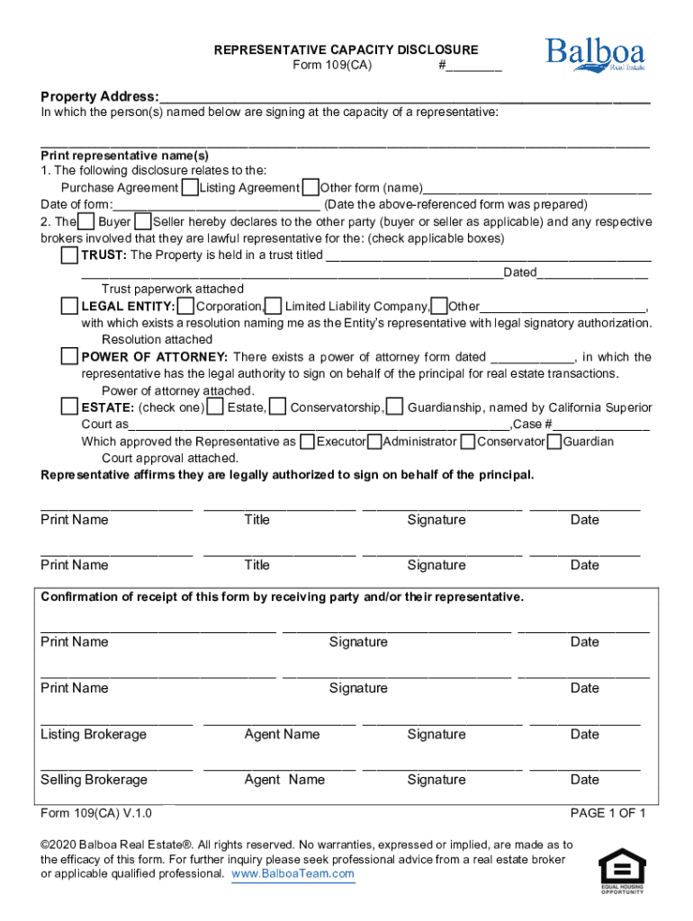 REPRESENTATIVE CAPACITY DISCLOSURE Form 109(CA) #___Property Address:___ In which the person(s) named below are signing at the capacity of a representative: ___ Print representative name(s) 1. The