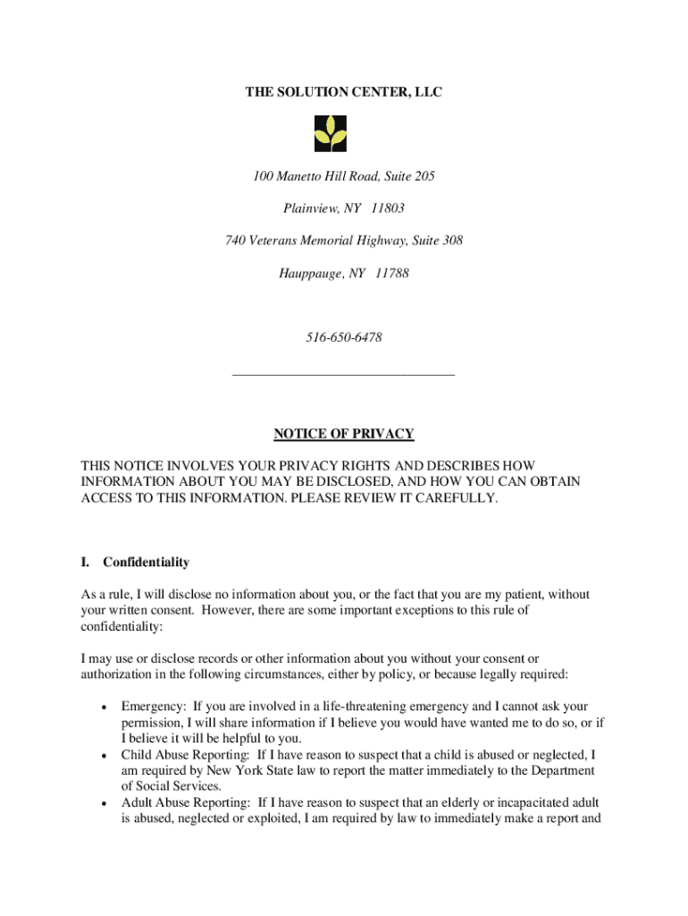 THE SOLUTION CENTER, LLC100 Manet to Hill Road, Suite 205 Plain view, NY 11803 740 Veterans Memorial Highway, Suite 308 Haulage, NY 117885166506478 ___NOTICE OF PRIVACY THIS NOTICE INVOLVES YOUR PRIVACY