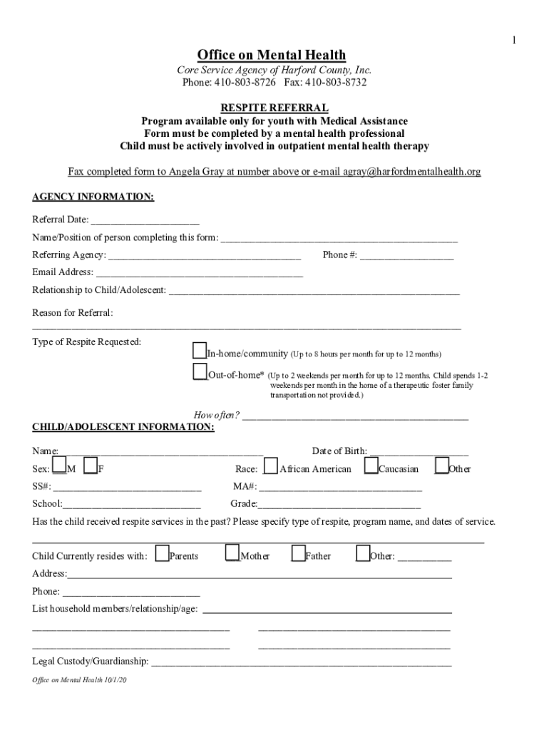 1Office on Mental Health Core Service Agency of Harford County, Inc. Phone: 4108038726 Fax: 4108038732 RESPITE REFERRAL Program available only for youth with Medical Assistance Form must be completed