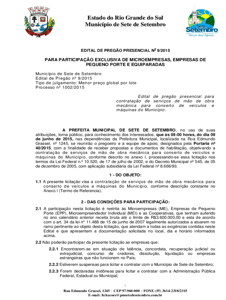 Municipal de Sete de SetembroEDITAL DE PRESO PRESENCE N0 9/2015PARA PARTICIPATE EXCLUSIVE DE MICROEMPRESAS, EMPRESS DE