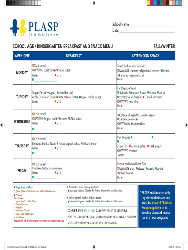 School Name:___ Date:___SCHOOL AGE / KINDERGARTEN BREAKFAST AND SNACK NEWSWEEK ONEBREAKFASTFALL/WINTERAFTERNOON SNACKMONDAYCold cereal WW/WE toast/Butter/Wow butter Water Milk ___Tuna/Chicken Mini
