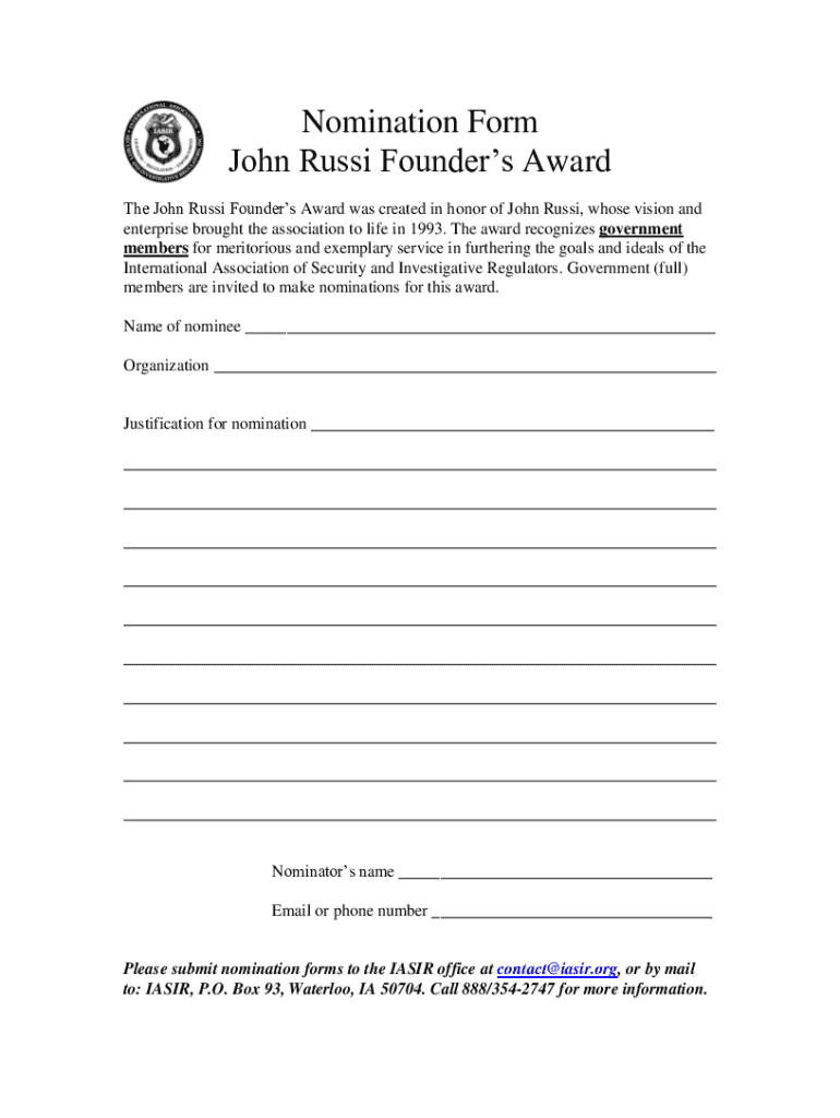 Get the free Nomination Form John Russi Founder's Award - IASIR