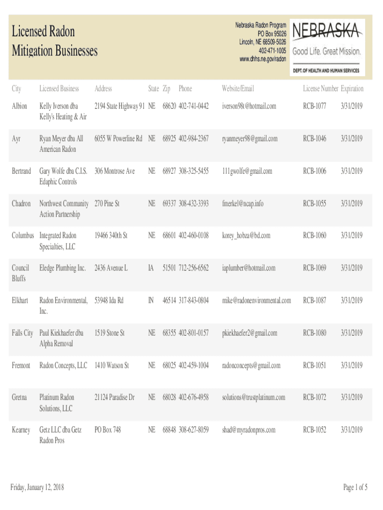 Nebraska Radon Program PO Box 95026 Lincoln, NE 685095026 4024711005 www.dhhs.ne.gov/radonLicensed Radon Mitigation Businesses CityLicensed BusinessAddressWebsite/EmailLicense Number ExpirationAlbionKelly