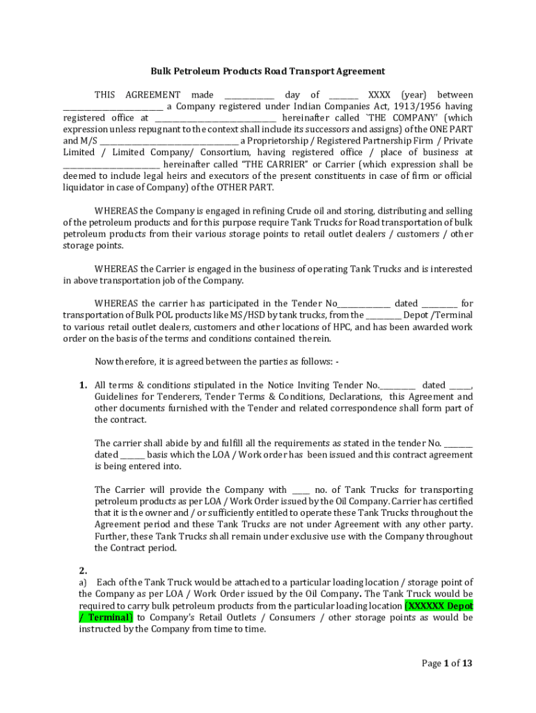 Bulk Petroleum Products Road Transport Agreement THIS AGREEMENT made ___ day of ___ XXX (year) between ___ a Company registered under Indian Companies Act, 1913/1956 having registered office at ___