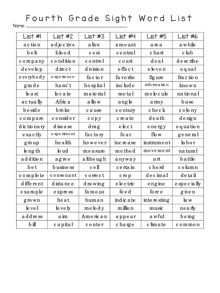 Fourth Grade Sight Word Misname: ___List #1 action belt company development #2 adjective blood condition directest #3 alive cost control division everybody experiences factor grade hasn't hospital