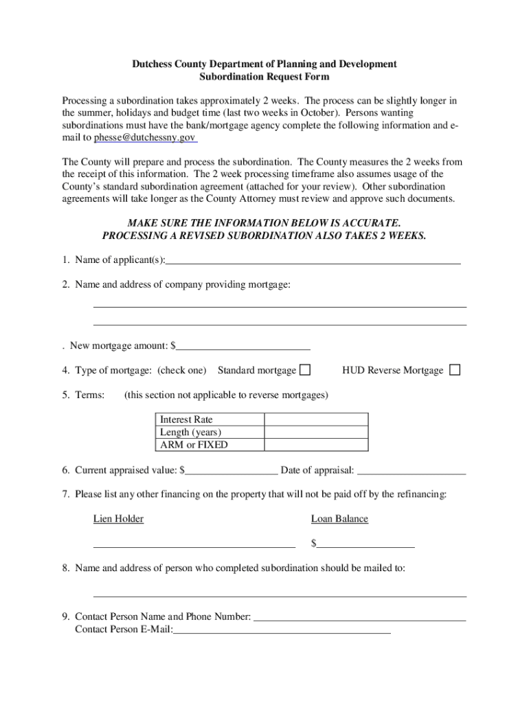 Dutchess County Department of Planning and Development Subordination Request Form Processing a subordination takes approximately 2 weeks. The process can be slightly longer in the summer, holidays