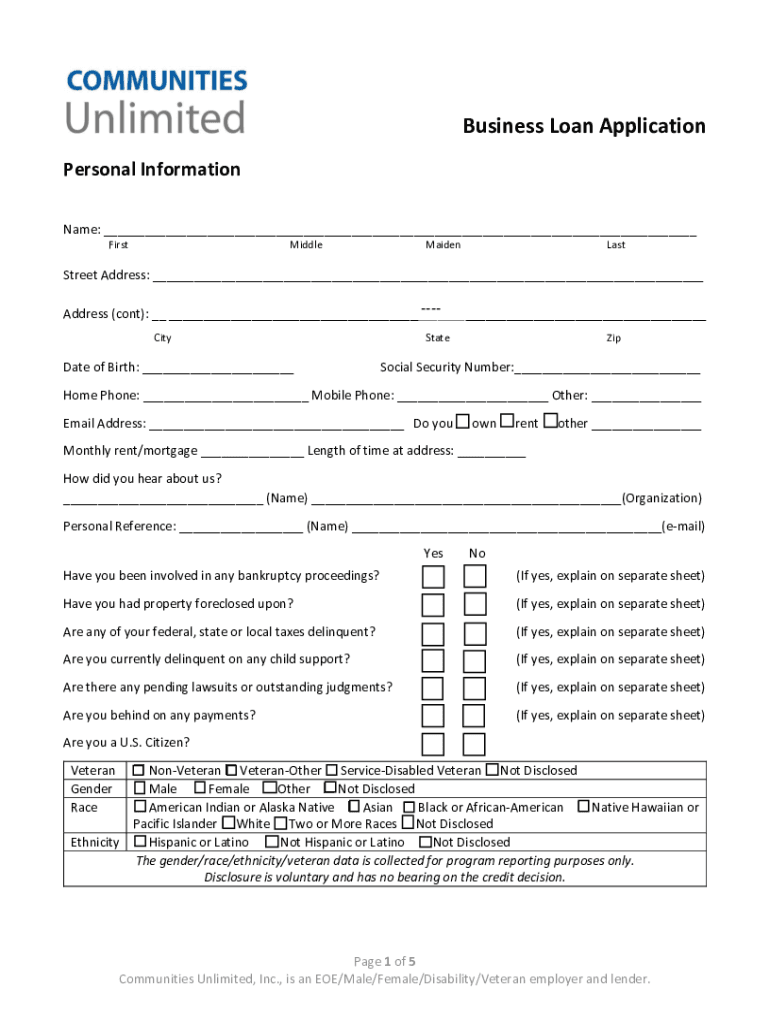 Business Loan Application Personal Information Name: ___ FirstMiddleMaidenLastStreet Address: ___Address (cont): __ ___ Citrate of Birth: ___StateZipSocial Security Number:___Home Phone: ___ Mobile