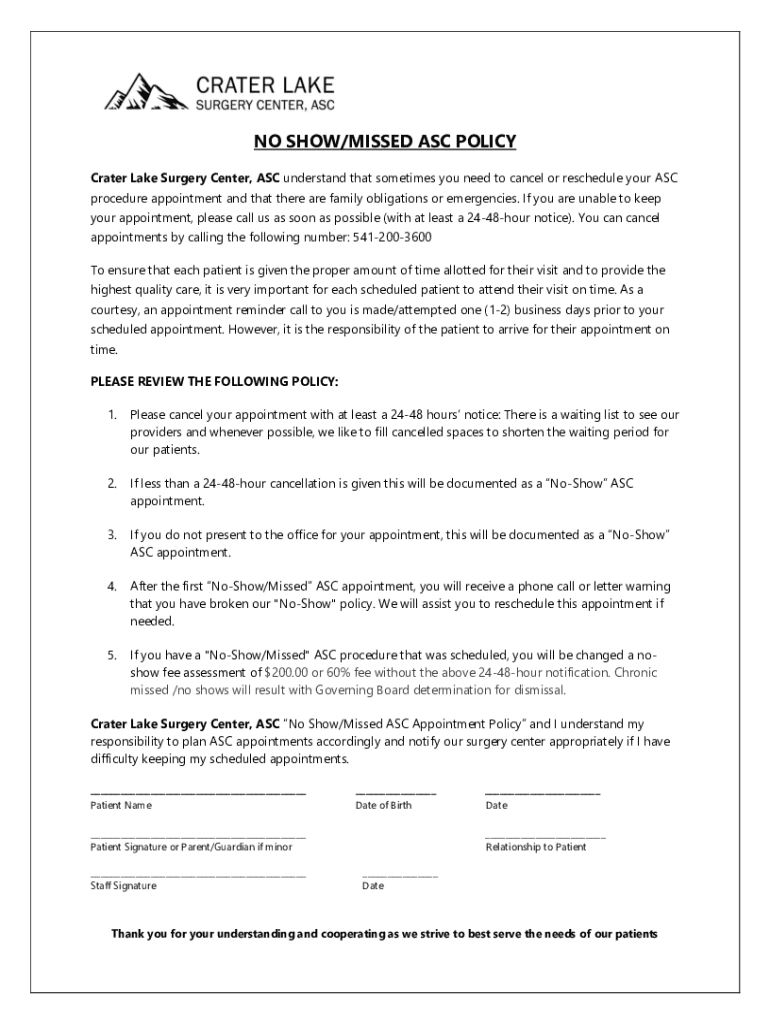 NO SHOW/MISSED ASC POLICY Crater Lake Surgery Center, ASC understand that sometimes you need to cancel or reschedule your ASC procedure appointment and that there are family obligations or emergencies.