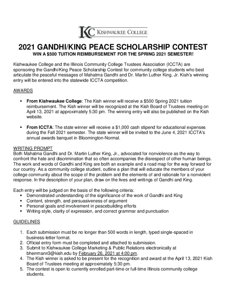 2021 GANDHI/KING PEACE SCHOLARSHIP CONTEST WIN A $500 TUITION REIMBURSEMENT FOR THE SPRING 2021 SEMESTER! Milwaukee College and the Illinois Community College Trustees Association (CICTA) are sponsoring