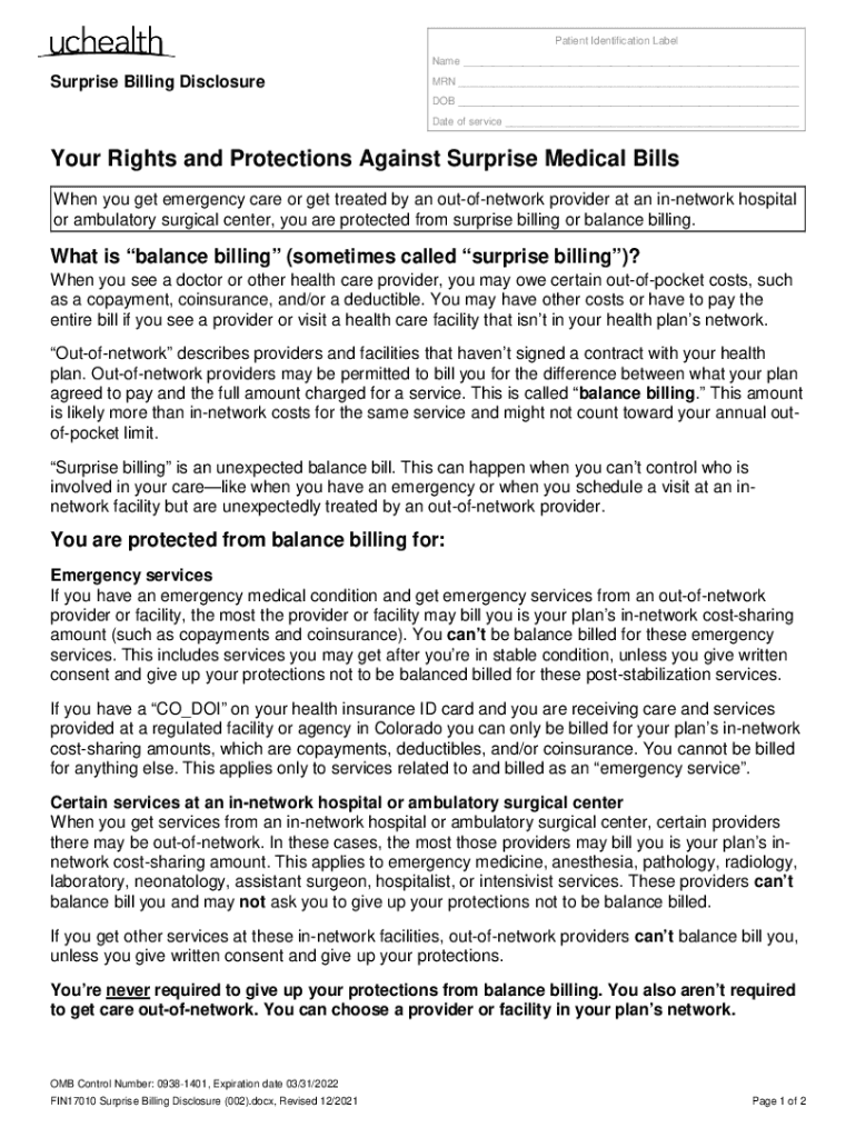 Obtain a copy of the fin17010 surprise billing disclosure form.