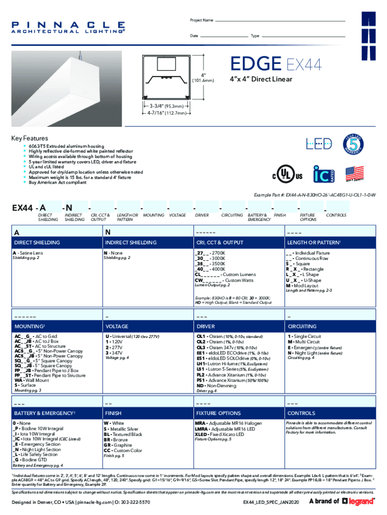 Project Name Dated 44 EX44TypeEDGE EX4444x 4 Direct Linear(101.6 mm)33/4 (95.3 mm) 47/16 (112.7 mm)Key Features 6063T5 Extruded aluminum housing Highly reflective deformed white painted reflector