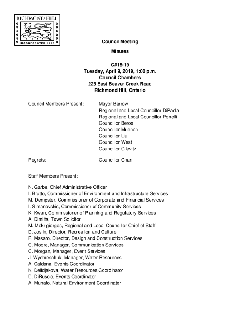 Council Meeting Minutes C#1519 Tuesday, April 9, 2019, 1:00 p.m. Council Chambers 225 East Beaver Creek Road Richmond Hill, Ontario Council Members Present:Mayor Barrow Regional and Local Councillor