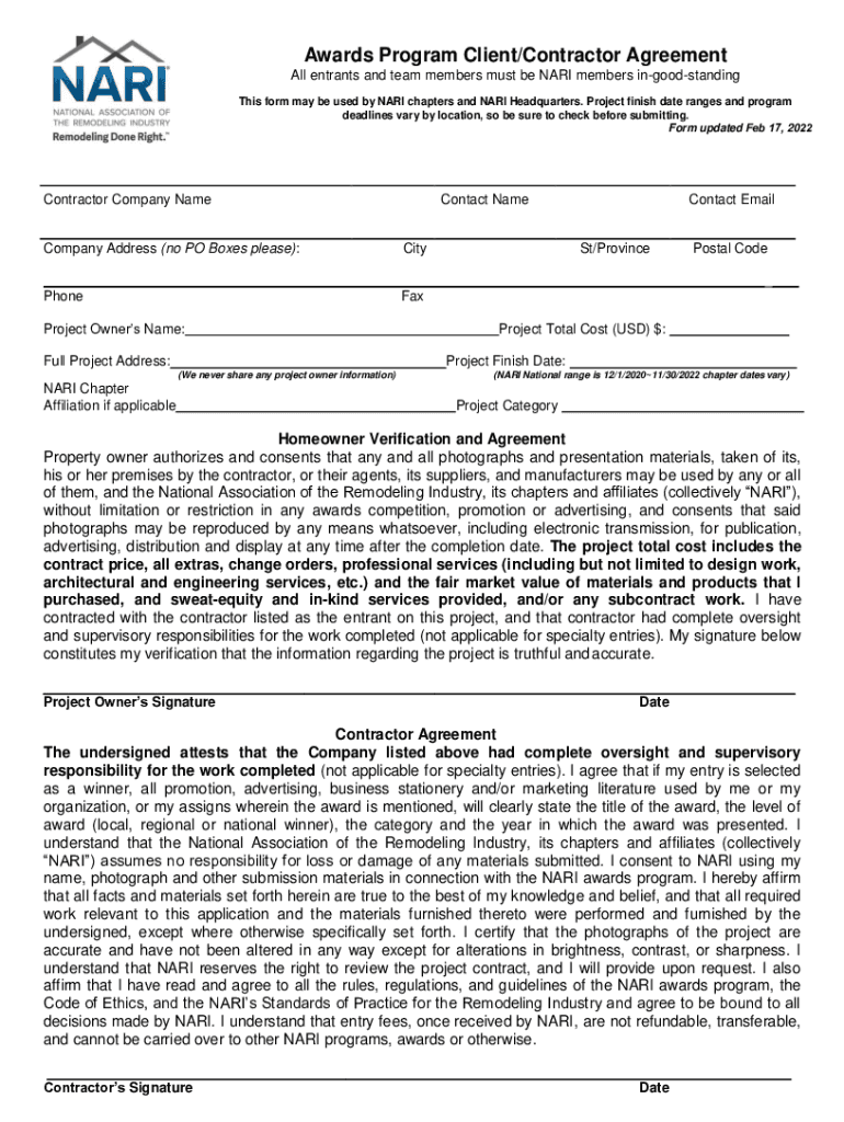 Both the client and contractor are required to file the awards program clientcontractor agreement.