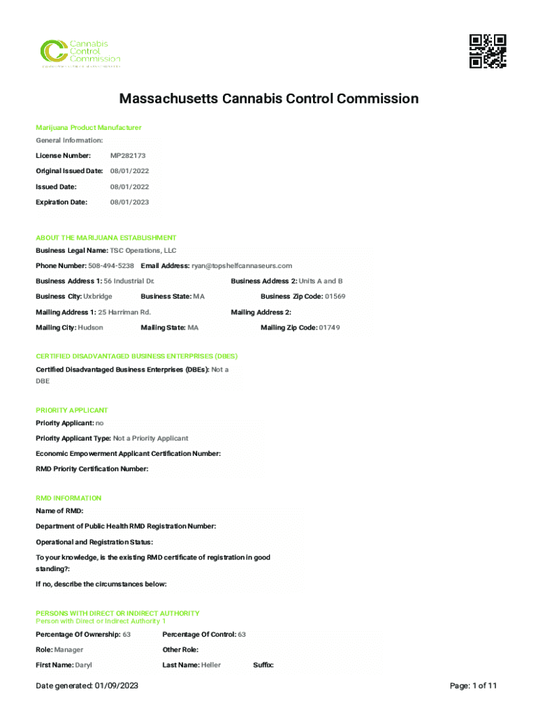 Massachusetts Cannabis Control Commission Marijuana Product Manufacturer General Information: License Number:MP282173Original Issued Date: 08/01/2022 Issued Date:08/01/2022Expiration Date:08/01/2023ABOUT