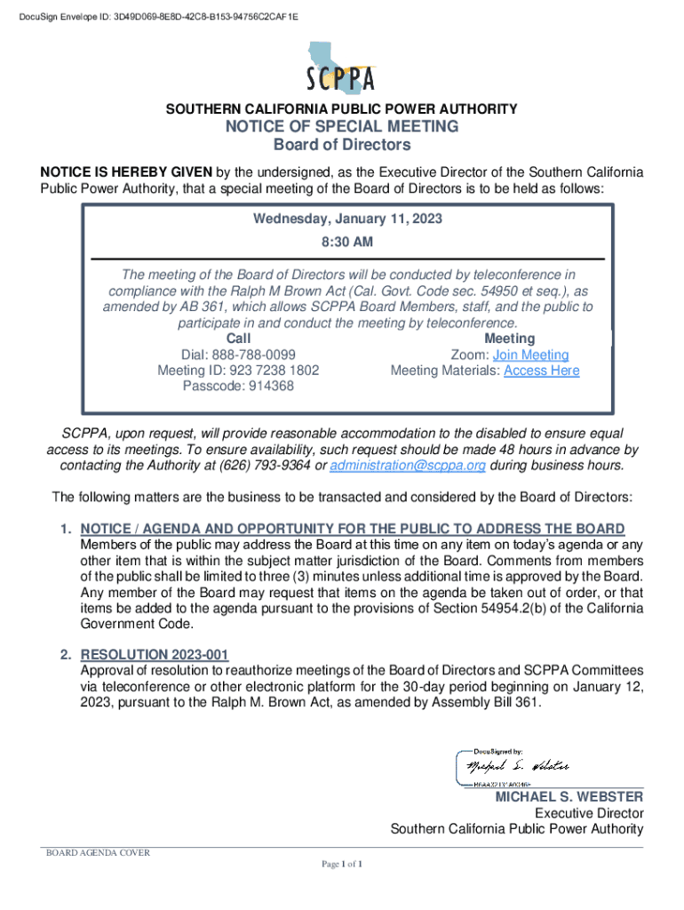 DocuSign Envelope ID: 3D49D0698E8D42C8B15394756C2CAF1ESOUTHERN CALIFORNIA PUBLIC POWER AUTHORITYNOTICE OF SPECIAL MEETING Board of Directors NOTICE IS HEREBY GIVEN by the undersigned, as the Executive
