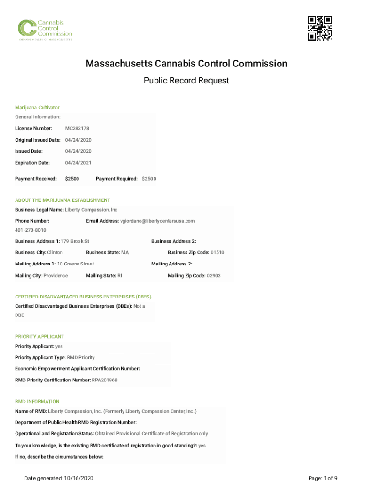 Massachusetts Cannabis Control Commission Public Record Request Marijuana Cultivator General Information: License Number:MC282178Original Issued Date: 04/24/2020 Issued Date:04/24/2020Expiration Date:04/24/2021Payment