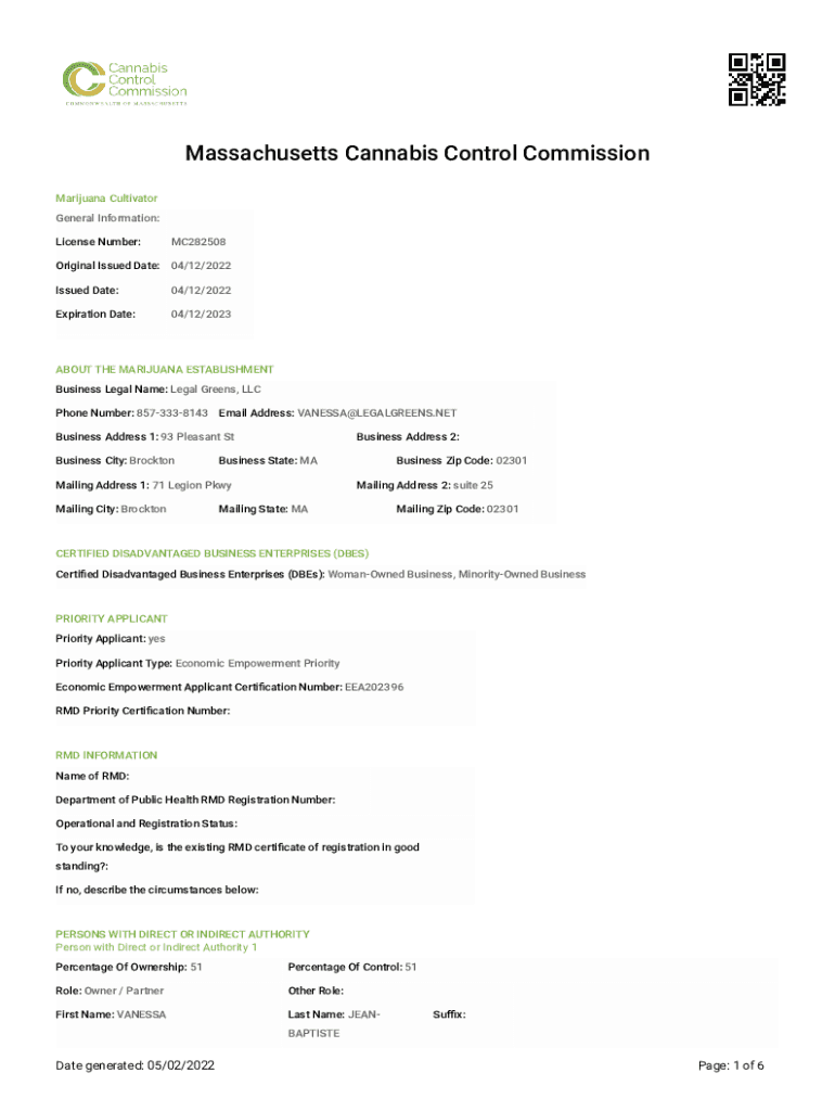 Massachusetts Cannabis Control Commission Marijuana Cultivator General Information: License Number:MC282508Original Issued Date: 04/12/2022 Issued Date:04/12/2022Expiration Date:04/12/2023ABOUT THE