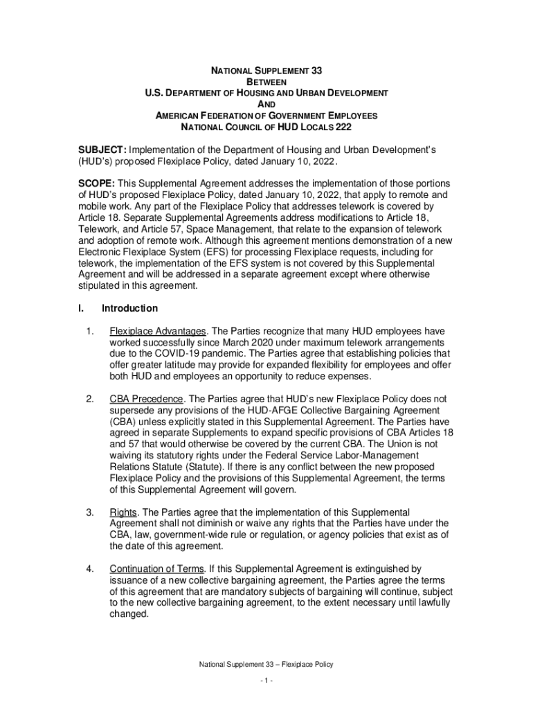 NATIONAL SUPPLEMENT 33 BETWEEN U.S. DEPARTMENT OF HOUSING AND URBAN DEVELOPMENT AND AMERICAN FEDERATION OF GOVERNMENT EMPLOYEES NATIONAL COUNCIL OF HUD LOCALS 222 SUBJECT: Implementation of the Department