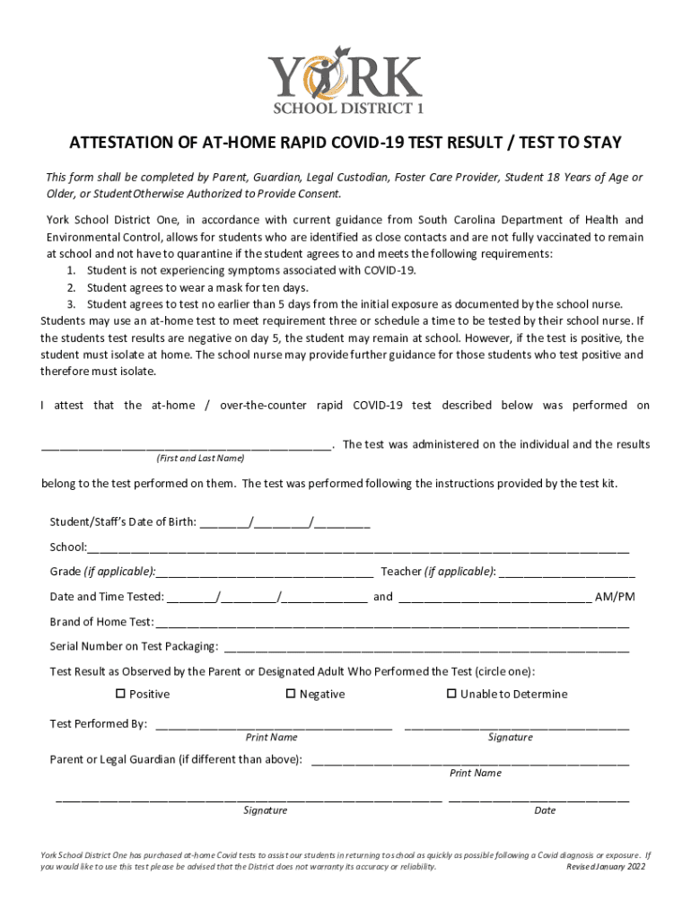 ATTESTATION OF HOME RAPID COVID-19 TEST RESULT / TEST TO STAY This form shall be completed by Parent, Guardian, Legal Custodian, Foster Care Provider, Student 18 Years of Age or Older, or Student