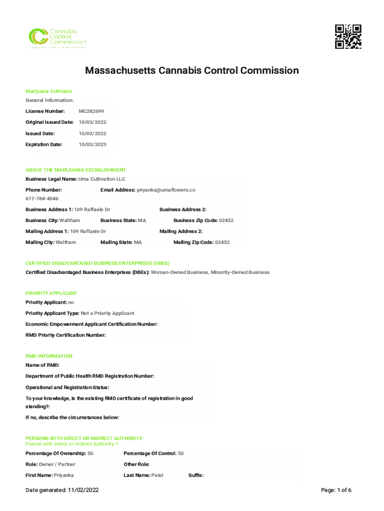 Massachusetts Cannabis Control Commission Marijuana Cultivator General Information: License Number:MC282699Original Issued Date: 10/03/2022 Issued Date:10/03/2022Expiration Date:10/03/2023ABOUT THE
