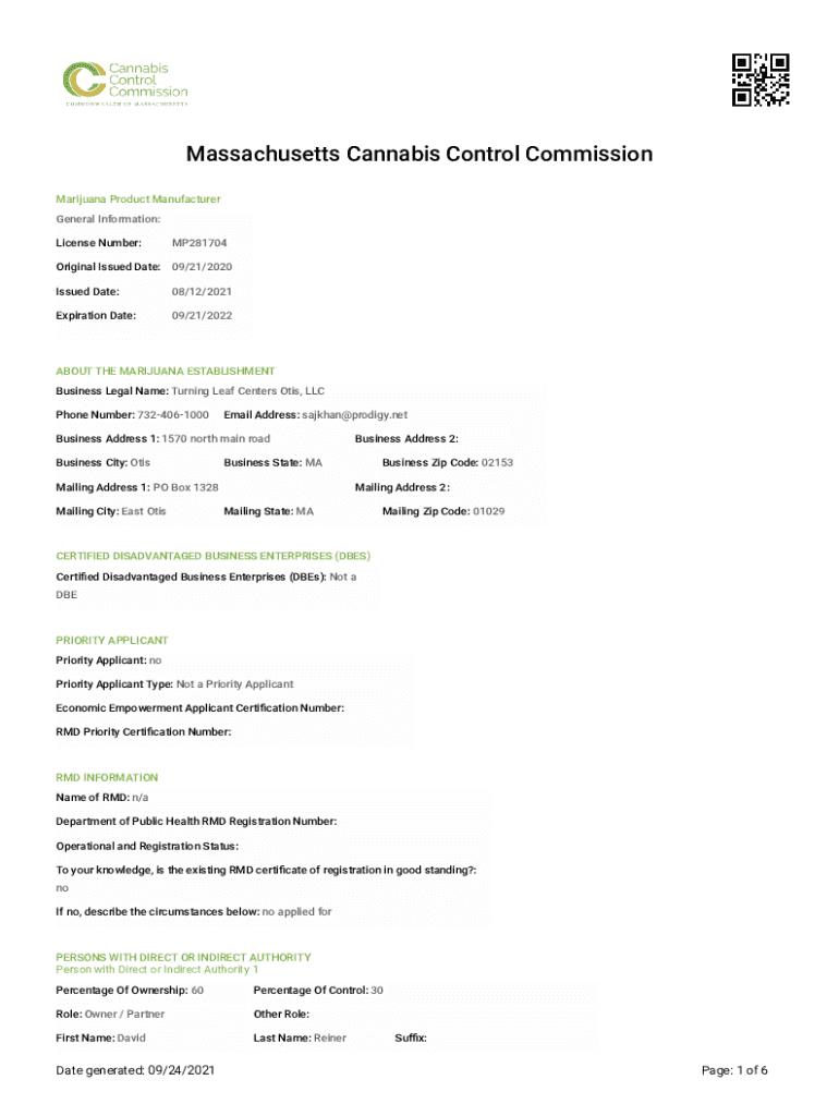 Massachusetts Cannabis Control Commission Marijuana Product Manufacturer General Information: License Number:MP281704Original Issued Date: 09/21/2020 Issued Date:08/12/2021Expiration Date:09/21/2022ABOUT