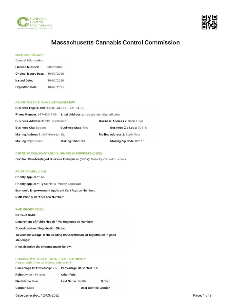 Massachusetts Cannabis Control Commission Marijuana Cultivator General Information: License Number:MC282052Original Issued Date: 10/07/2020 Issued Date:10/07/2020Expiration Date:10/07/2021ABOUT THE
