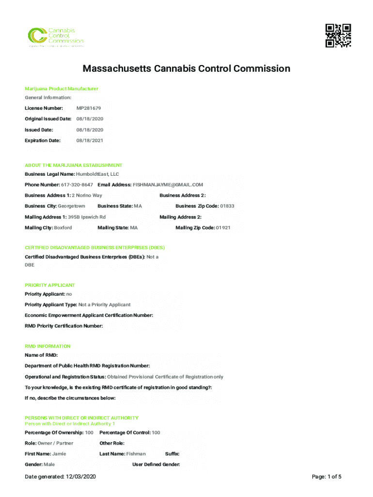 Massachusetts Cannabis Control Commission Marijuana Product Manufacturer General Information: License Number:MP281679Original Issued Date: 08/18/2020 Issued Date:08/18/2020Expiration Date:08/18/2021ABOUT