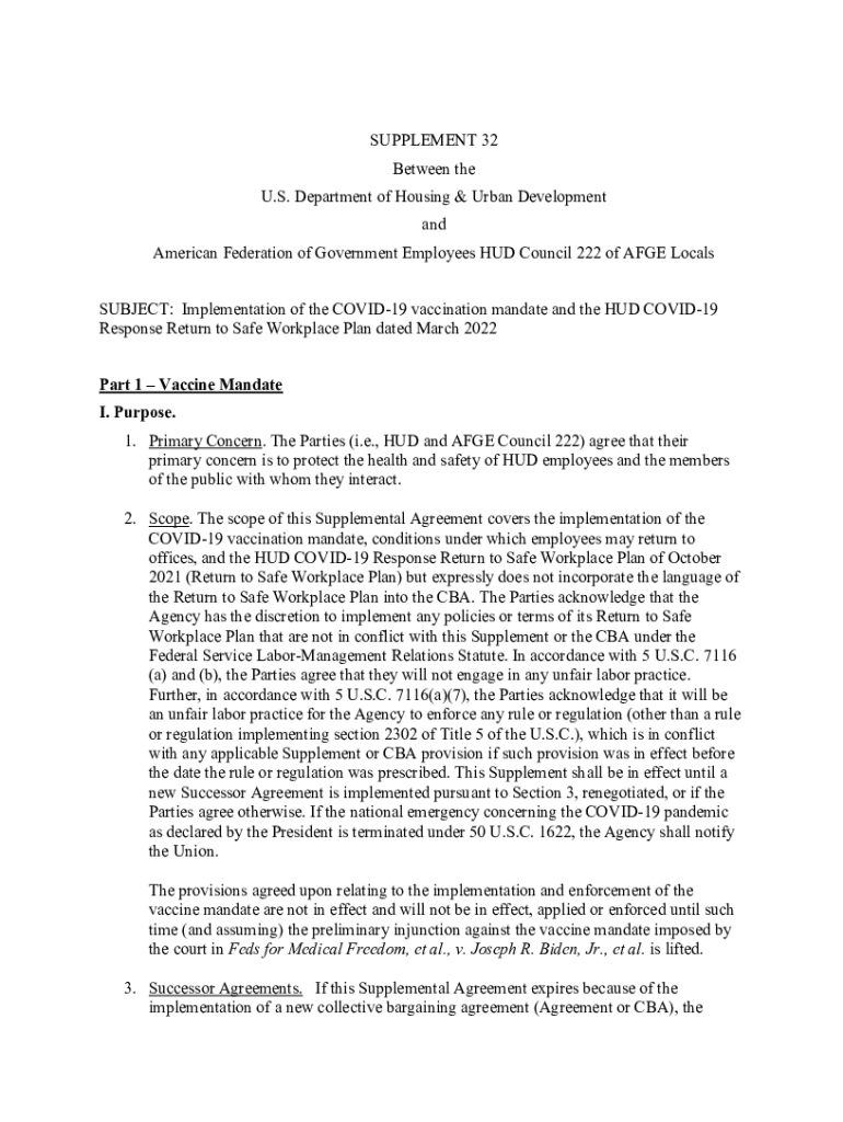 SUPPLEMENT 32 Between the U.S. Department of Housing & Urban Development and American Federation of Government Employees HUD Council 222 of AGE Locals SUBJECT: Implementation of the COVID-19 vaccination