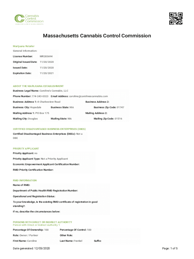 Massachusetts Cannabis Control Commission Marijuana Retailer General Information: License Number:MR283694Original Issued Date: 11/20/2020 Issued Date:11/20/2020Expiration Date:11/20/2021ABOUT THE